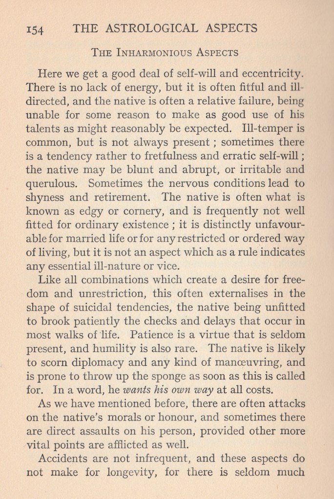Harmonious aspects are the trine family – 120, 60, 30. Inharmonious are the opposition family – 180, 135, 90, 45. (He also included here the “quincunx” aspect of 150, but in my view that is part of the trine family; astrologers will argue with me about this until the cows come home, so take it for what it’s worth.)