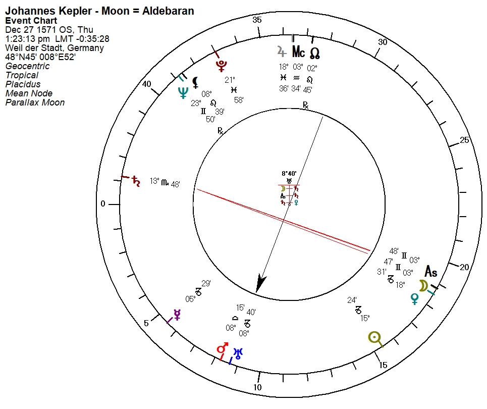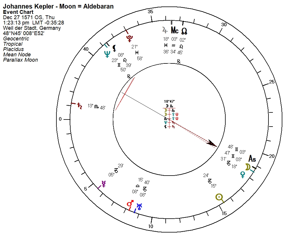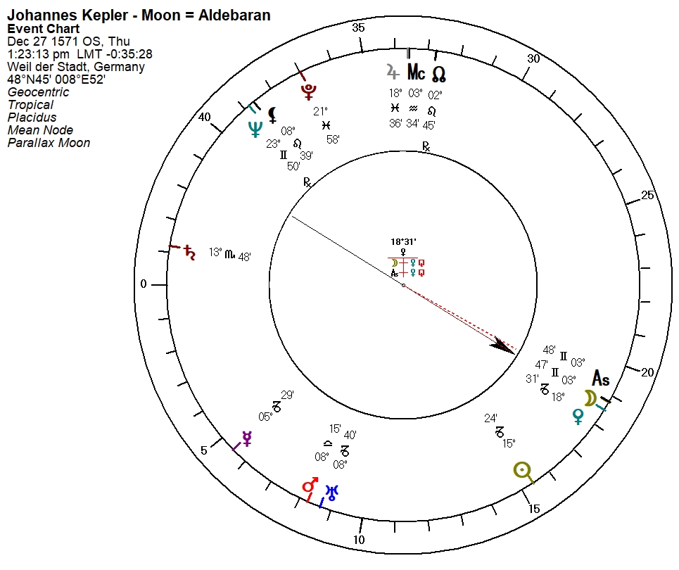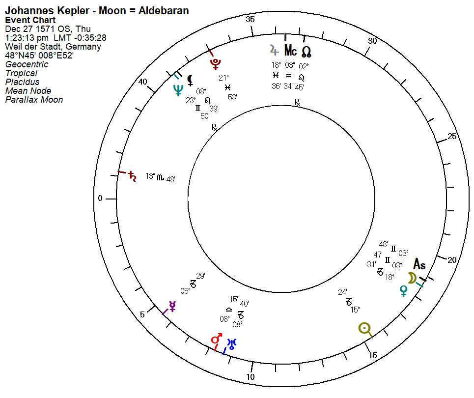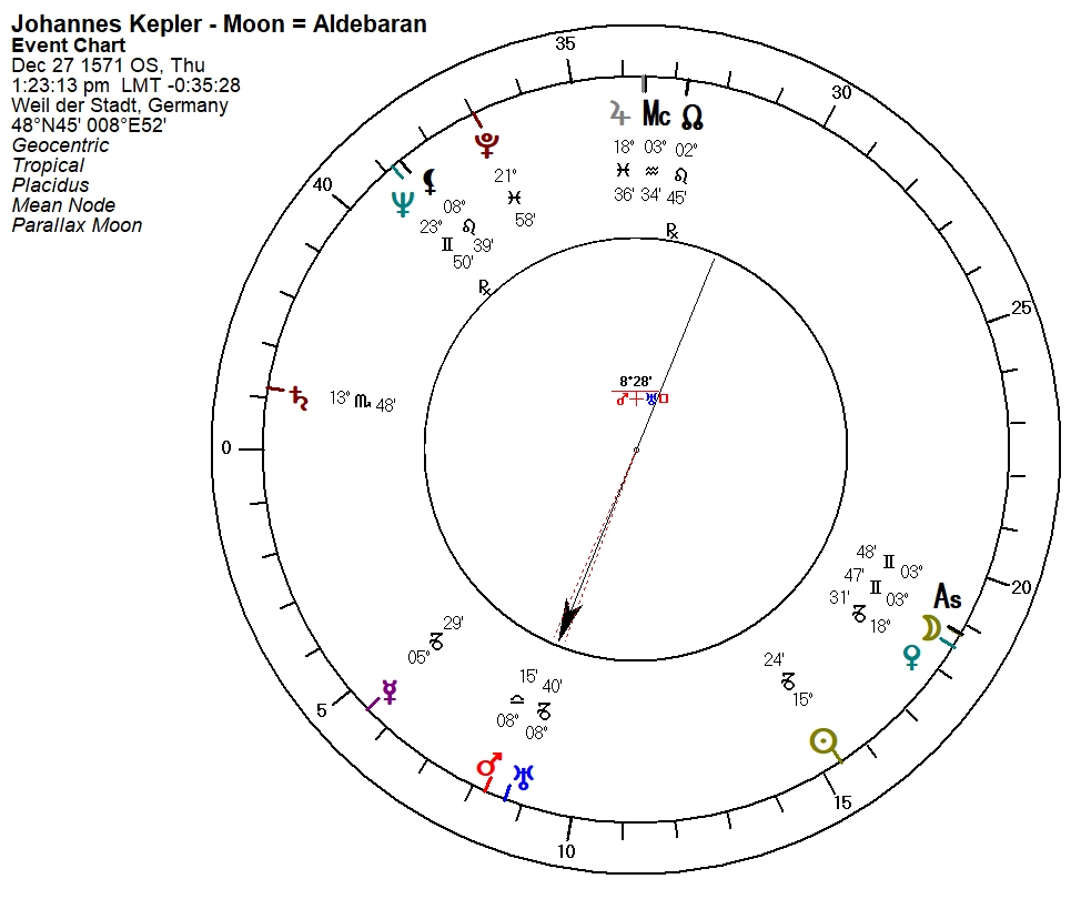 After Sun and Moon, I like to look at what planets are in the closest aspect, and we should not be surprised that Kepler’s natus boasts Mars in a sinister square to Uranus. “Sinister” is perhaps an obsolete term, but the point is that Mars, the faster planet, is moving toward the conjunction and away from the opposition, rather than the other way around. If we were to be perfectly technical, Mars and Uranus are in a 270° aspect here.