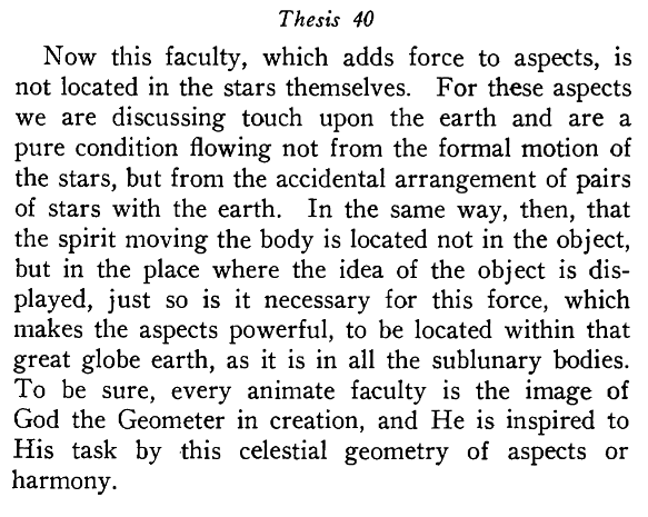 JK was interested in musical harmonies, and he was certain that the heavens operated in some kind of musical format, because that’s what God would do, being the creator of pleasures and pains. The following are translations of his 1601 work, On The More Certain Fundamentals of Astrology: