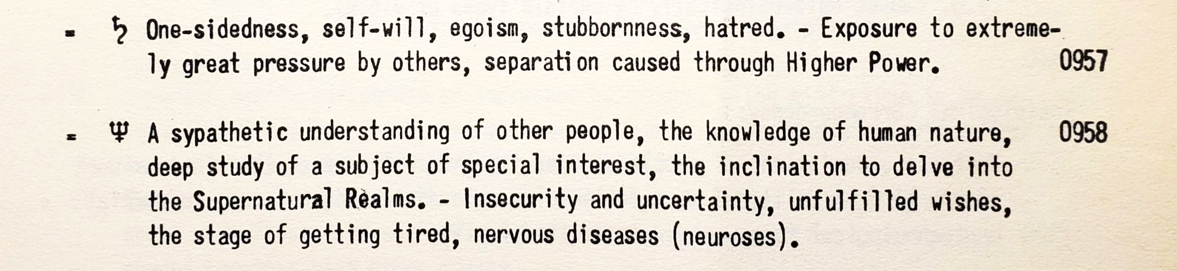 Ebertin wasn’t exactly upbeat about the Uranus/Pluto combo, and who would be, given the ingredients! The fisrt entry is for SA = UR/PL, and the second is for the NE = UR/PL from Part 1: