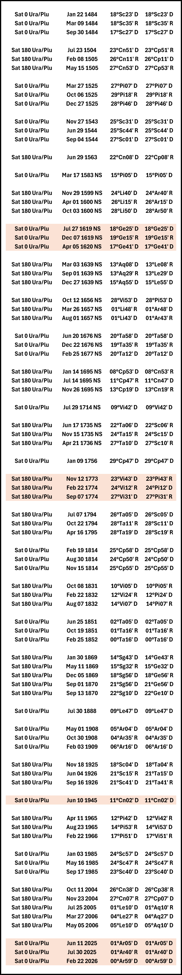 For this one, I went all the way back to the European discovery of the Western Hemisphere, and selected ingresses to only cardinal points – 0 Aries, 0 Cancer, 0 Libra, and 0 Capricorn. The attached spreadsheet of UR/PL on cardinal points (also available below as a graphic) shows that UR/PL was on the VP in 1775 and 1776, which we know was the era of the Revolutionary War: