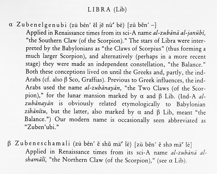 That strange star name comes from the Arab word for “southern claw.” Before Libra was the Scales, it was not its own constellation, but instead part of The Scorpion – the claws part: