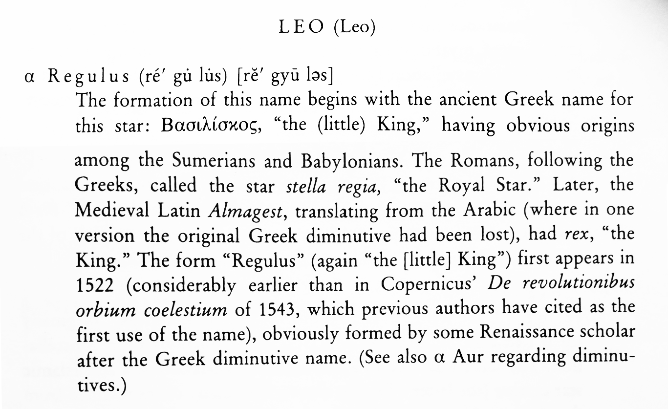I’ve discussed Regulus in this blog previously, but here is a refresher on the name from Sky & Telescope’s Dictionary of Star Names: