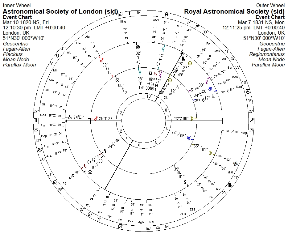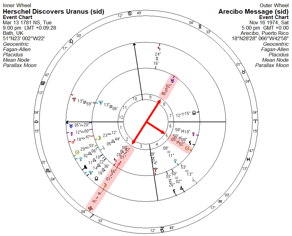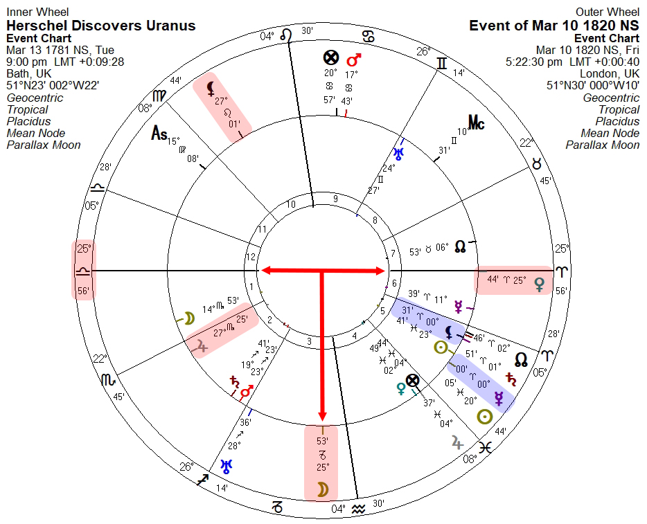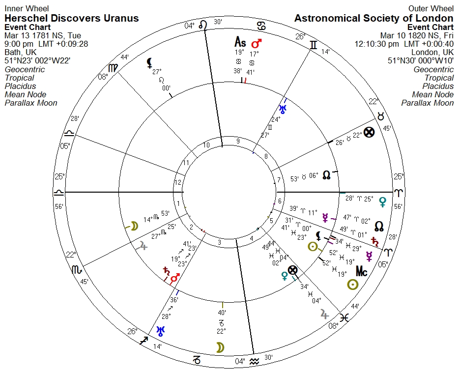 In any event, if we place the discovery chart in a bi-wheel with the ASL first meeting chart, we might think that the latter was indeed chosen to honor Herschel’s big discovery, given that ASL Jupiter is right on discovery Part of Fortune, and ASL Venus is on the ASL descendant: