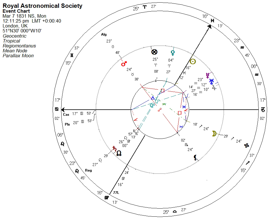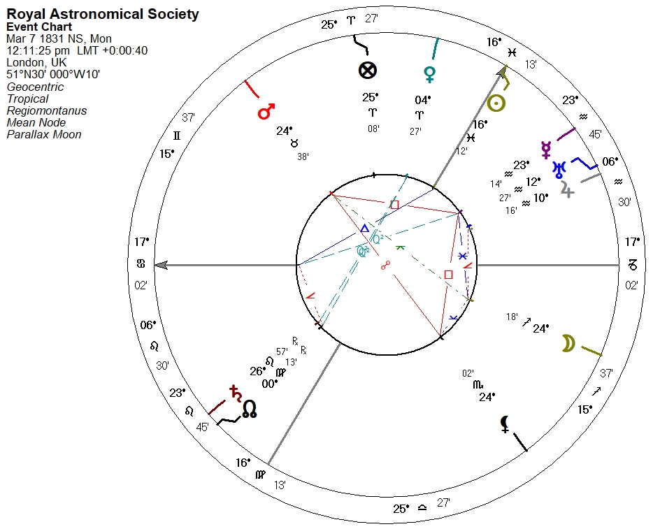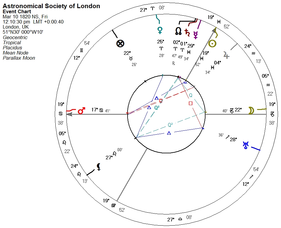 I am unable to locate a time for the first official meeting of the Astronomical Society of London [ASL] at Freemason’s Tavern, so a Sun-on-the-MC chart, or what we call a “high noon chart,” will have to suffice: