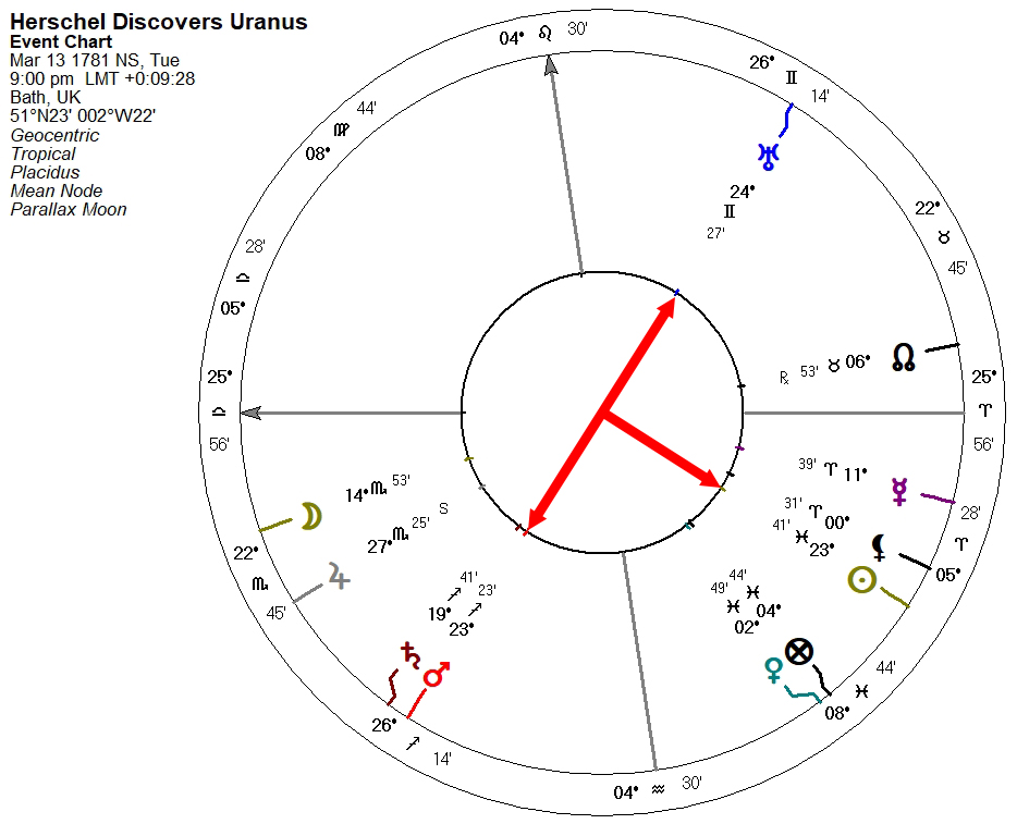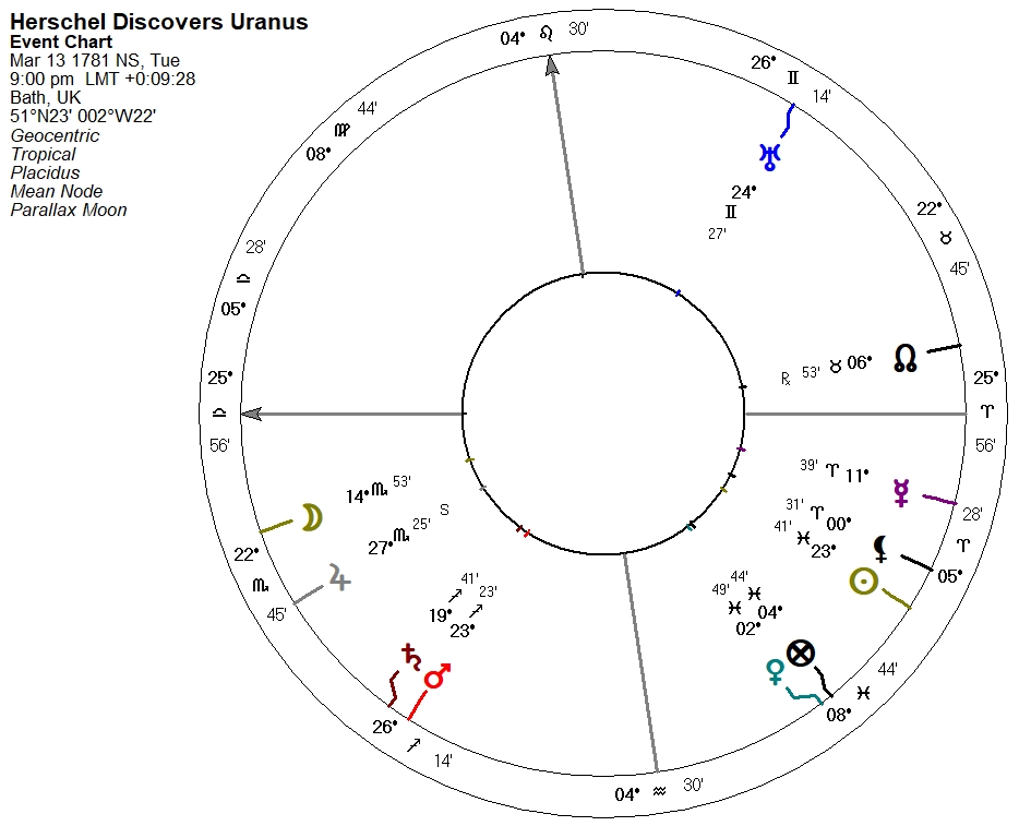 Uranus was first noticed by Herschel on the night of March 13, 1781, during one of his usual night sky observation exercises. The exact time he noticed the new star is unknown, but I think it was probably after 8 pm and before moonrise. Therefore, I settled on an approximate time of 9 pm for a working radix: