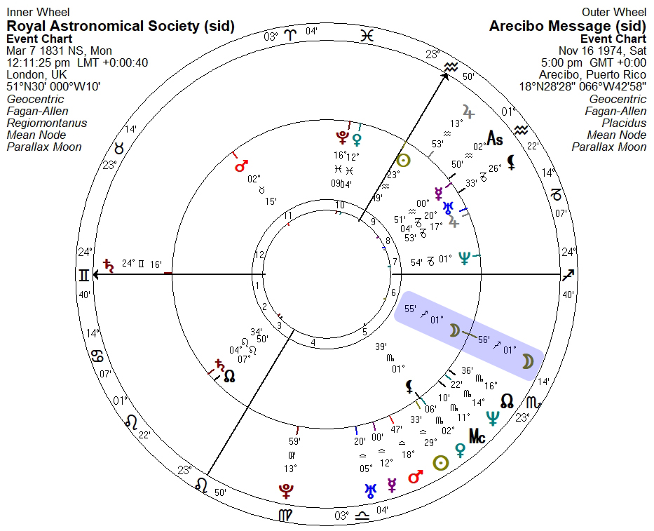 We can also see that Arecibo Saturn is right on the RAS ascendant, which is trine the RAS Sun. (Another interchart connection is RAS Mars and Black Moon aligned to Arecibo Venus and Ascendant.)