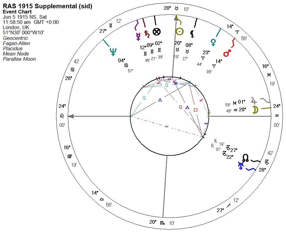 The supplemental of June 5, 1915 will have a new planet, Neptune, to take into consideration. Here is the chart, cast for noon because that’s the Royal way: