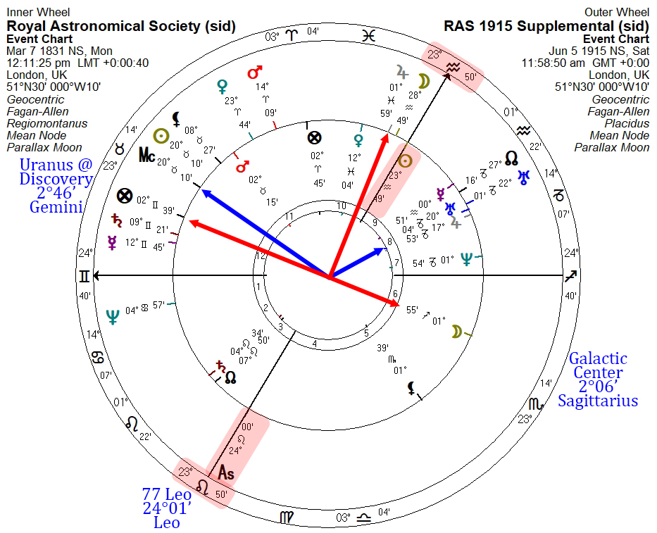 I included the interchart trine from RAS 1831 Uranus to RAS 1915 Sun. Placing the Uranus discovery chart with the RAS 1915 chart, we can see the T-square has been emphasized yet again: